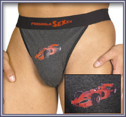 Formula Sexxx-String ... von 0 auf 20 cm in 5 Sekunden! Anthrazit/blauer Rio mit rotem Renn-Wagen bedruckt. Breiter Gummibund mit Formula Sexxx-Schriftzug. 100% Baumwolle.