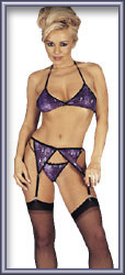 SAMT-STRAPS-SET Top mit Stretchbändern + Strapsgürtel + String. Aus lila-farbenem Samt in angedeuteter Python-Optik. Schwarz paspeliert. 100% Polyester. Inkl. Strümpfe.