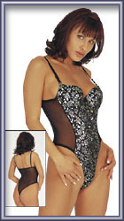 Schwarzer Transparent-Einteiler mit wunderschön gearbeiteter Front im silber-bunt-schillernden Rosen-Design. Gefütterte Bügel-Cups, Träger verstellbar. Schritt-Teil mit Verschluss. 100% Polyamid.